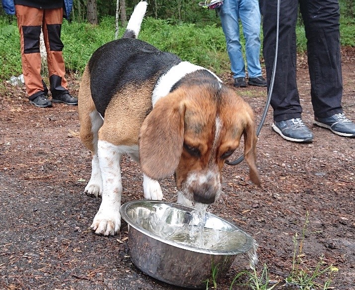 Kepeässä beaglein välisessä kilvoittelussa miteltiin ensin kykyä saada uponnut nakinpala n 9 cm syvän vesikupin syvyydestä esiin. Tyylejä oli monenlaisia lähtien nakin tuijottelusta, tassun kanssa kalasteluun. Voittajan, vedestä piittaamaton täsmäisku nakinpalaan ei jättänyt tilaa selityksille.