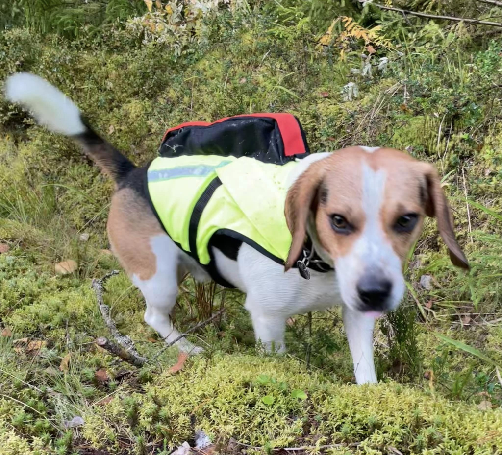 Huomioliivi on hyvä olla koirallakin. Safety first!