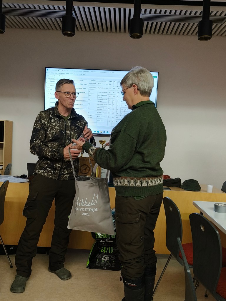 Kaakon Beaglen puheenjohtaja Ossi Hilden luovutti kilpailun voittaneelle joukkueelle kiertopalkinnon, jonka Annamari Manner Suur-Savon Beagle edustajana vastaanotti.